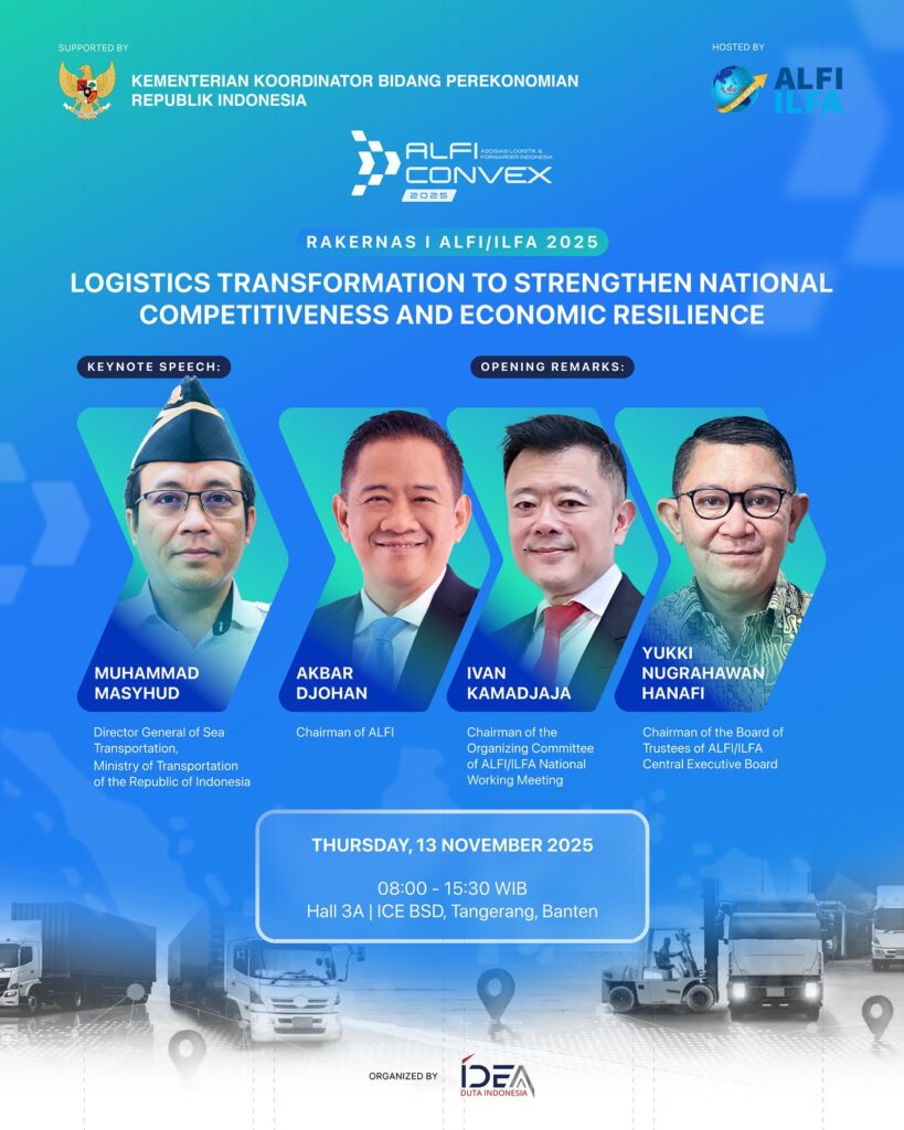 Rangkaian ALFI CONVEX 2025 kembali menghadirkan salah satu agenda terpentingnya: Rapat Kerja Nasional (Rakernas) ALFI/ILFA 2025, yang akan berlangsung pada 13 November 2025, pukul 08.00–15.30 WIB, di Hall 3A, ICE BSD, Tangerang.